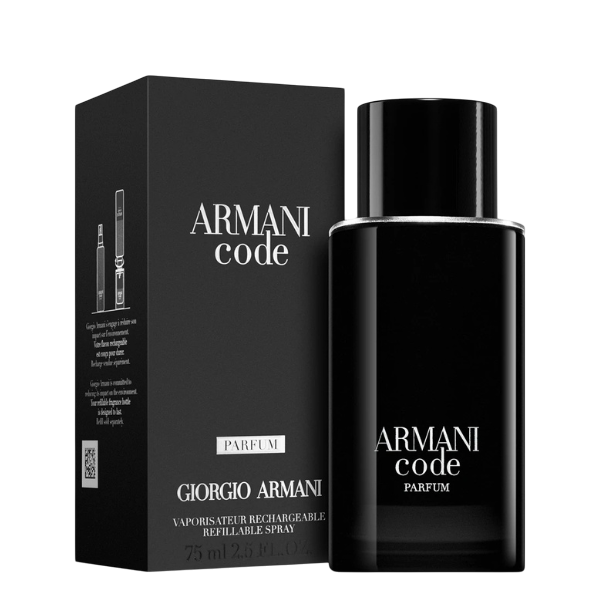Armani Code Parfum de Giorgio Armani, lancé en 2022, est une fragrance boisée aromatique qui réinvente la signature olfactive iconique d’Armani Code. Conçu pour l’homme moderne, ce parfum marie puissance et sensibilité, avec une fraîcheur vive de bergamote, une élégance florale d’iris et une chaleur sensuelle de fève tonka. Son flacon noir aux lignes carrées arrondies, rechargeable et éco-conçu, incarne le luxe durable et l’engagement de Giorgio Armani pour l’environnement.