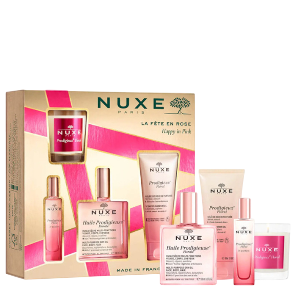 Coffret sensoriel réunissant quatre soins emblématiques de NUXE à la fragrance florale et joyeuse.
